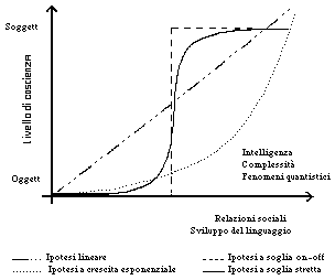 Oggigiorno non è chiaro quale sia l'elemento determinante per l'insorgere della coscienza. Non è neppure chiaro se la coscienza insorga in modo brusco o graduale. Nel grafico vengono mostrati alcuni possibili andamenti dell'evoluzione della coscienza. Per esempio, la linea tratteggiata corrisponde a una visione on-off della nascita della coscienza. Altre teorie vengono rappresentate da linee con pendenza e forma diverse (linea continua, linea tratto-punto, linea punto-punto). Si deve sottolineare che la linea tratto punto non presenta un limite superiore perché non è detto che ci sia un grado massimo di coscienza. Vari candidati (codice genetico, anima trascendente, complessità, grado di intelligenza, fenomeni quantistici, relazioni sociali, sviluppo delle capacità linguistiche) sono stati proposti per le unità sulle ascisse. L'essere cosciente è legato a qualche altro fattore che l'evoluzione ha selezionato e che lo sviluppo realizza per ciascun individuo . Non sappiamo neppure se esistano limiti a questa capacità di essere coscienti o se possa avere una ulteriore espansione. E' necessario sottolineare che l'essere coscienti è separato dall'essere vivi. Essere vivi significa essere costituiti da molecole basate sulla replicazione del DNA, essere coscienti significa essere in grado di fare esperienza del mondo. Il fatto che, per ora gli unici esseri coscienti siano anche esseri vivi non deve precludere il tentativo di costruire esseri coscienti senza fare ricorso a strutture biologiche viventi. Una ulteriore precisazione: in base alle conoscenze odierne, niente lega la struttura del DNA o dell'atomo di carbonio al nostro essere coscienti. E se questo fosse vero significa che è possibile supporre e immaginare il modo in cui una struttura artificiale possa produrre un soggetto dotato di esperienze coscienti. In sintesi, è possibile che il secolare impasse in cui si è imbattuta la scienza, nello spiegare la natura della mente cosciente, sia causato non tanto dalla natura della problema in sé quanto dalle ipotesi che acriticamente si sono accettate sulla natura della realtà. Cambiando queste, e sottoponendole al vaglio dell'evidenza è possibile che si guadagni una migliore comprensione tanto della coscienza quanto della realtà. In ogni caso il problema della coscienza artificiale sembra costituire l'ultimo atto della storia dell'ingegneria. Dando al termine ingegnere il termine estensivo di colui che fa, la costruzione di un artefatto in grado di poter dire Io esisto potrebbe rappresentare il sogno finale dell'essere umano costruttore che vuole costruire anche senza sapere. Vitruvio, che costruiva (ai tempi dell'antica Roma) ponti senza conoscere le leggi della statica, poteva essere considerato un ingegnere che costruiva senza sapere. All'inizio del terzo Millennio l'atto finale del grande dramma dell'essere umano che vorrebbe capire soprattutto se stesso, potrebbe venire scritto non attraverso che la scienza che vorrebbe capire come funziona la mente umana, bensì attraverso l'ingegneria che ci permetterebbe, attraverso la coscienza artificiale di poter comunicare con dei Soggetti, che siamo stati noi a costruire. (Ndr: ripreso dal mensile MEDIA DUEMILA di giugno 2002) |