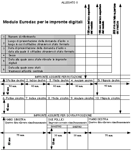 Regolamento (CE) n. 407/2002 del Consigliodel 28 febbraio 2002 IL CONSIGLIO DELL'UNIONE EUROPEA, visto il regolamento (CE) n. 2725/2000 del Consiglio, dell'11 dicembre 2000, che istituisce l'"Eurodac" per il confronto delle impronte digitali per l'efficace applicazione della convenzione, di Dublino (in prosieguo "regolamento Eurodac") (1), in particolare l'articolo 22, paragrafo 1,considerando quanto segue: (1) L'articolo 22, paragrafo 1, del regolamento Eurodac prevede che il Consiglio adotti le modalità di applicazione necessarie a definire la procedura di cui all'articolo 4, paragrafo 7 e la procedura applicabile al congelamento dei dati di cui all'articolo 12, paragrafo 1, e a compilare le statistiche di cui all'articolo 12, paragrafo 2 del regolamento Eurodac. (2) La Danimarca, a norma degli articoli 1 e 2 del protocollo sulla posizione della Danimarca allegato al trattato sull'Unione europea e al trattato che istituisce la Comunità europea, non partecipa all'adozione del presente regolamento e di conseguenza non è vincolata ad esso né è soggetta alla sua applicazione, HA ADOTTATO IL PRESENTE REGOLAMENTO: Articolo 1 Ai sensi del presente regolamento, si intende per: a) "unità centrale", l'unità di cui all'articolo 1, paragrafo 2, lettera a) del regolamento Eurodac; b) "base di dati", la base di dati centrale informatizzata di cui all'articolo 1, paragrafo 2 lettera b), del regolamento Eurodac; c) "confronto", la procedura di verifica della corrispondenza dei dati relativi alle impronte digitali registrati nella base di dati con quelli trasmessi da uno Stato membro. Articolo 2 1. Le impronte digitali vengono digitalizzate e trasmesse nel formato dei dati indicato nell'allegato I. L'unità centrale, se necessario al suo funzionamento efficace, definisce i requisiti tecnici per la trasmissione del formato dei dati da parte degli Stati membri all'unità centrale e viceversa. L'unità centrale assicura che i dati relativi alle impronte digitali trasmessi dagli Stati membri possano essere confrontati dal sistema informatizzato per il riconoscimento delle impronte digitali. 2. Gli Stati membri dovrebbero trasmettere i dati di cui all'articolo 5, paragrafo 1 del regolamento Eurodac per via elettronica. L'unità centrale, se necessario al suo funzionamento efficace, definisce i requisiti tecnici per assicurare che i dati possano essere adeguatamente trasmessi per via elettronica dagli Stati membri all'unità centrale e viceversa. La trasmissione dei dati su carta utilizzando il modulo riportato nell'allegato II o mediante altri supporti (dischetti, CD-ROM o altri supporti che saranno sviluppati e generalmente utilizzati in futuro) dovrebbe rimanere limitata ai casi di prolungati guasti tecnici. 3. Il numero di riferimento di cui all'articolo 5, paragrafo 1, lettera d) del regolamento Eurodac rende possibile l'attribuzione univoca dei dati a una persona e allo Stato membro che trasmette i dati. Esso inoltre rende possibile asserire se tali dati si riferiscono a un richiedente asilo o a una persona di cui agli articoli 8 o 11 del regolamento Eurodac. Il numero di riferimento inizia con la o le lettere di identificazione che contraddistinguono lo Stato membro che ha trasmesso i dati, conformemente alla norma di cui all'elenco dell'allegato I. La o le lettere di identificazione sono seguite dal codice che identifica la categoria di persone. I dati relativi ai richiedenti asilo sono contrassegnati da "1 ", quelli relativi alle persone di cui all'articolo 8 del regolamento Eurodac da "2 "e quelli relativi alle persone di cui all'articolo 11 del regolamento Eurodac da "3 ". L'unità centrale definisce le procedure tecniche necessarie affinché gli Stati membri assicurino il ricevimento di dati univoci da parte dell'unità centrale. 4. L'unità centrale conferma il più rapidamente possibile il ricevimento dei dati trasmessi. A tal fine l'unità centrale definisce i requisiti tecnici necessari ad assicurare che agli Stati membri sia fornita, se richiesta, la ricevuta di conferma. Articolo 3 1. Gli Stati membri assicurano la trasmissione di dati relativi alle impronte digitali di qualità adeguata al confronto mediante il sistema informatizzato per il riconoscimento delle impronte digitali. L'unità centrale definisce la qualità adeguata dei dati relativi alle impronte digitali trasmessi, se necessario ad assicurare che i risultati del confronto da essa effettuato raggiunga un livello molto elevato di accuratezza. L'unità centrale verifica, non appena possibile, la qualità dei dati relativi alle impronte digitali trasmessi. Qualora essi non siano idonei al confronto mediante il sistema informatizzato per il riconoscimento delle impronte digitali, l'unità centrale chiede allo Stato membro di trasmettere quanto prima dati relativi alle impronte digitali qualitativamente più adeguati. 2. L'unità centrale effettua i confronti seguendo l'ordine di arrivo delle richieste. Ogni richiesta deve essere esaminata entro 24 ore. In caso di dati trasmessi per via elettronica, uno Stato membro può chiedere che, per motivi di diritto interno, i confronti ritenuti particolarmente urgenti siano effettuati entro un'ora. Qualora questi tempi non possano essere rispettati a causa di circostanze che esulano dalla responsabilità dell'unità centrale, l'unità centrale evade la richiesta in via prioritaria non appena dette circostanze sono venute meno. In tali casi l'unità centrale, se necessario ad assicurare il suo funzionamento efficace, definisce i criteri per assicurare che le richieste siano evase in via prioritaria. 3. L'unità centrale, se necessario ad assicurare il suo funzionamento efficace, definisce le procedure operative per l'elaborazione dei dati ricevuti e per la trasmissione del risultato del confronto. Articolo 4 I dati trasmessi dagli Stati membri all'unità centrale e viceversa utilizzano i servizi generici di IDA di cui alla decisione n. 1719/1999/CE del Parlamento europeo e del Consigl