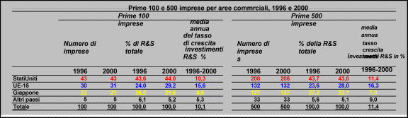 Fonte : Third European Report on S&T Indicators, 2003 Le imprese tedesche, francesi e britanniche sono all'origine della maggior parte degli investimenti R&S delle prime 500 imprese in Europa (con 9,7%, 5,8% e 5,3% rispettivamente). Le imprese di questi paesi costituiscono inoltre la quota maggioritaria degli investimenti di R&S delle grandi imprese europee con 34,7% per la Germania, 20,9% per la Francia e 19,1 per il Regno Unito. L'elenco che segue riprende le 100 principali imprese dell'UE in termini di spese di R&S.