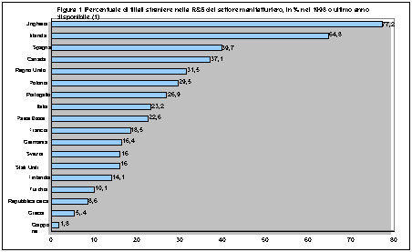 Fonte : Third European Report on S&T Indicators, 2003   Gli investimenti di R&S delle maggiori imprese: ripartizione settoriale Tra i 500 primi esecutori di R&S le tecnologie dell'informazione e della comunicazione (TIC) costituiscono il settore in cui si investe maggiormente nelle conoscenze (27,4%). Tra le prime imprese europee, in cui le TIC arrivano seconde, questa percentuale è notevolmente inferiore (16%). A livello mondiale, l'automobile e i pezzi di ricambio si classificano secondi con 17,6%, mentre i prodotti farmaceutici sono terzi col 15,5%. Nell'UE, l'automobile ed i pezzi di ricambio sono in testa col 24%, seguiti dai prodotti farmaceutici e dalle TIC (16% entrambi). L'allargamento dell'Europa e l'obiettivo del 3% L'aggiunta di dieci nuovi Stati membri comporterà un aumento del PIL pari a 3,9% nel 1999 e di 4,8% nel 2002; una diminuzione della quota delle spese totali di R&S nel PIL da 1,92% a 1,87% (dati del 2000) (l'impatto limitato è dovuto al PIL relativamente debole dei futuri Stati membri) ed un aumento del numero di ricercatori del 10% circa (aumento ampiamente proporzionale). I dati evidenziano inoltre che la spesa di R&S in molto Stati membri (Repubblica ceca, Estonia, Lituania, Ungheria e Cipro) è in costante aumento dal 1995 ad un ritmo più elevato rispetto alla media dei quindici Stati membri dell'UE. Informazioni recenti fornite dai ministeri della Ricerca dei futuri Stati membri indicano, per la maggior parte di questi paesi, l'esistenza di piani per consolidare o intensificare le attività di R&S. Portata e aumento della quota straniera nel finanziamento della R&S nazionale Ad eccezione della Grecia (5,4%), le partecipazioni straniere finanziano la R&S del settore della produzione negli Stati membri dell'UE in proporzioni analoghe o superiori - con percentuali che vanno dal 14% in Finlandia al 64,8% in Irlanda - agli Stati Uniti (16%) o al Giappone (1,8%).