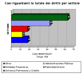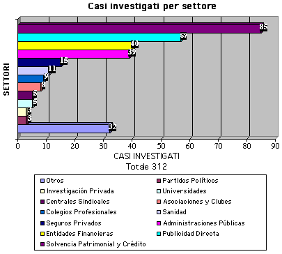 La tabella sopra riportata fornisce una ripartizione del numero di archivi pubblici. Nel 1998, sono stati inoltre gestiti dal GDPR i seguenti archivi che stabiliscono codici standard: - Revisione del Codice di condotta per l'archivio dei tassi di incidenti tra i conducenti: è stato richiesto dall'Unione spagnola degli assicuratori e riassicuratori (Unión Española de Entidades Aseguradoras y Reaseguradoras, UNESPA), nell'intento di conformarsi meglio alla LORTAD, in particolare per quanto riguarda la tutela dei diritti delle persone i cui dati compaiono nell'archivio dei tassi di incidenti tra i conducenti, un archivio comune creato dalle compagnie di assicurazione a fini statistici e per impedire le frodi nella selezione dei rischi e la risoluzione delle denunce di incidente. Il codice è stato creato dalla Commissione tecnica sulla sicurezza dei veicoli dell'UNESPA, che è proprietaria di questo archivio, ed è applicabile a tutti gli assicuratori che si abbonano all'archivio. - Codice etico per la protezione dei dati personali su Internet, richiesto dalla Federazione spagnola per il commercio elettronico e il marketing diretto (Federación Española de Comercio Electrónico y Marketing Directo, FECEMD), che riconosce la necessità di stabilire norme che disciplinino l'impegno volontario da parte delle società presenti su Internet a tutelare la vita privata delle persone durante il trattamento automatizzato dei dati personali, consentendo a tutte le società che commercializzano prodotti o servizi on-line e trattano dati personali di sottoscrivere il presente codice. Un capitolo del codice è dedicato alla determinazione di principi aggiuntivi applicabili ad attività on-line dedicate specificamente ai minori, che potrebbero non essere in grado, come gli adulti, di comprendere la natura dell'informazione richiesta o l'uso cui essa è destinata. 1.2.2 Ispezione dei dati Nel 1998, l'Agenzia ha dato corso a procedimenti in 493 casi, sia per determinare se vi fosse stata un'inadempienza alle disposizioni della legge organica 5/1992 sia per tutelare i cittadini che ritenevano di essere stati ostacolati nell'esercizio dei propri diritti di accesso, correzione o cancellazione ad essi accordati dalla legge. La maggioranza dei casi perveniva da ricorsi di persone all'Agenzia per la protezione dei dati. I grafici allegati forniscono una ripartizione di questi casi per settore. Dei 312 procedimenti d'indagine, 191 si sono risolti nel 1998, e altri 171 sono stati aperti nel 1997 e sono ancora in corso nel 1998, per un totale di 362 casi chiusi. Si è inoltre concluso il trattamento dei 27 archivi relativi alle richieste di informazioni precedenti ai cittadini che hanno presentato il ricorso e che, alla fine, non hanno comportato l'apertura di un procedimento d'indagine specifico. Tali cifre mostrano che, in pratica, i due terzi dei casi iniziati nel 1998 si sono conclusi nel corso dell'anno. Nel 1998, sono stati iniziati 154 casi riguardanti la tutela dei diritti di cui 117 sono stati chiusi: a questa cifra vanno aggiunti altri 37 casi simili iniziati nel 1997. Dei procedimenti sanzionatori e di amministrazione pubblica gestiti, ne sono stati risolti rispettivamente 147 e 6. Sono state inoltre predisposte 292 risoluzioni motivate di bocciatura. 1.2.3 Informazioni ai cittadini Nel 1998, al Dipartimento di informazione dei cittadini (Área de Atención al Ciudadano) sono pervenute 12.780 richieste telefoniche (contro le 10.000 del 1997), 1500 richieste dirette (1300 nel 1997) e 1453 richieste scritte (1009 nel 1997). Queste cifre indicano un incremento del 15,4% del numero di richieste dirette, un aumento del 30% delle richieste telefoniche e del 44% di quelle scritte. L'aumento delle richieste scritte è dovuto in parte all'esistenza di una casella di posta elettronica via Internet a disposizione del pubblico. Le richieste inviate per posta elettronica ammontano a oltre il 25% di tutte le richieste scritte pervenute. I grafici che seguono indicano il tipo di richieste nonché il tipo di archivi interessati: 1.2.4 Cooperazione con altre autorità e organismi internazionali L'Agenzia per la protezione dei dati ha proseguito la propria partecipazione attiva all'Organismo di controllo comune istituito dall'accordo di Schengen: è stata presente ai sette incontri tenuti dall'organismo nonché ai vari incontri tecnici in preparazione dell'ispezione di monitoraggio da parte dell'Unità centrale di sostegno tecnico, stabilita a Strasburgo, per analizzare uno studio preliminare attualmente in corso che stabilisce i requisiti del nuovo sistema di informazione di Schengen (SIS II). Si è conclusa l'ispezione dell'ufficio spagnolo SIRENE come pure la campagna pubblicitaria sui diritti dei cittadini in seno al SIS: ciò ha comportato la produzione e distribuzione di 400 poster e 50.000 opuscoli; il ministero degli Esteri e degli Interni hanno aiutato a distribuirli presso gli uffici consolari e ai crocevia di frontiera esterni (aerei, marittimi o terrestri) nell'area di Schengen. Nel 1998, è stato inoltre istituito l'organismo di controllo comune (JSB-Eurpol), previsto dall'articolo 24 delle Convenzione Europol. L'organismo è costituito da un massimo di due rappresentanti di ogni autorità nazionale per la protezione dei dati. Il Consiglio dei ministri ha sottoscritto l'accordo il 25 settembre nominando in rappresentanza della Spagna l'Agenzia per la protezione dei dati: l'accordo ha stabilito inoltre che il ministero degli Esteri informerà di questa nomina il Segretario generale del Consiglio dell'Unione europea, depositario della Convenzione Europol. Un altro argomento emerso nel corso della XXa Conferenza internazionale delle autorità per la protezione dei dati (Conferencia Internacional de Autoridades de Control en materia de protección de datos) tenutasi a Santiago de Compostela è che l'Agenzia per la protezione dei dati e la Registratiekamer (l'Autorità olandese per la protezione dei dati) erano