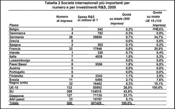 Fonte : Third European Report on S&T Indicators, 2003 Le imprese tedesche, francesi e britanniche sono all'origine della maggior parte degli investimenti R&S delle prime 500 imprese in Europa (con 9,7%, 5,8% e 5,3% rispettivamente). Le imprese di questi paesi costituiscono inoltre la quota maggioritaria degli investimenti di R&S delle grandi imprese europee con 34,7% per la Germania, 20,9% per la Francia e 19,1 per il Regno Unito. L'elenco che segue riprende le 100 principali imprese dell'UE in termini di spese di R&S.