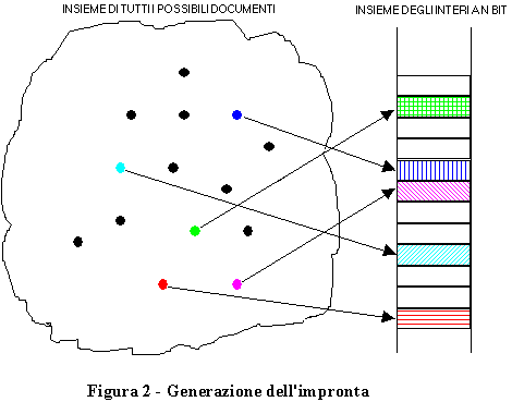 Al testo da firmare viene applicata una funzione di hash appositamentestudiata che produce, secondo il meccanismo sinteticamente mostratonella Figura 2, una stringa binaria di lunghezza costante e piccola,normalmente 128 o 160 bit. La funzione di hash assicura l'unicitàdi tale stringa, nel senso che a due testi diversi non corrispondela medesima impronta. Sono disponibili diversi algoritmi di generazione,quali, ad esempio, MD2, MD4 [RIVE90] e MD5 [RIVE92], originariamenteprogettati per operare in combinazione con lo RSA ma utilizzabilicon qualsiasi cifrario. Sono disponibili anche algoritmi di hashper i quali è in corso la standardizzazione ufficiale daparte organismi internazionali, ne sono un esempio il RIPEMD a128 e 160 bit ed il Secure Hash Algorithm (SHA-1) [JTC196].