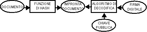 L'operazione di verifica della firma digitale, mostrata schematicamentein Figura 3, viene effettuata ricollocando, con la medesima funzionedi hash usata nella fase di sottoscrizione, il valore dell'improntae controllando che il valore così ottenuto coincida conquello generato per decodifica della firma digitale stessa. Ladisponibilità del valore dell'impronta all'interno delmessaggio semplifica l'operazione.
