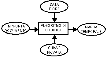 - L'impronta marcata viene cifrata con la chiavesegreta del servizio, ottenendo la marca temporale da cui èpossibile recuperare, mediante la chiave pubblica del servizio,l'impronta del documento e la data e l'ora della sua generazione.