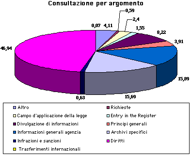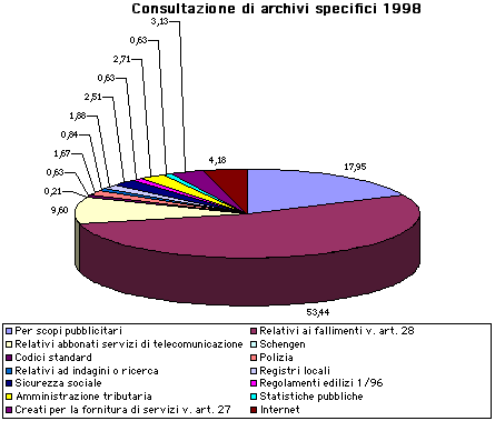 La tabella sopra riportata fornisce una ripartizione del numero di archivi pubblici. Nel 1998, sono stati inoltre gestiti dal GDPR i seguenti archivi che stabiliscono codici standard: - Revisione del Codice di condotta per l'archivio dei tassi di incidenti tra i conducenti: è stato richiesto dall'Unione spagnola degli assicuratori e riassicuratori (Unión Española de Entidades Aseguradoras y Reaseguradoras, UNESPA), nell'intento di conformarsi meglio alla LORTAD, in particolare per quanto riguarda la tutela dei diritti delle persone i cui dati compaiono nell'archivio dei tassi di incidenti tra i conducenti, un archivio comune creato dalle compagnie di assicurazione a fini statistici e per impedire le frodi nella selezione dei rischi e la risoluzione delle denunce di incidente. Il codice è stato creato dalla Commissione tecnica sulla sicurezza dei veicoli dell'UNESPA, che è proprietaria di questo archivio, ed è applicabile a tutti gli assicuratori che si abbonano all'archivio. - Codice etico per la protezione dei dati personali su Internet, richiesto dalla Federazione spagnola per il commercio elettronico e il marketing diretto (Federación Española de Comercio Electrónico y Marketing Directo, FECEMD), che riconosce la necessità di stabilire norme che disciplinino l'impegno volontario da parte delle società presenti su Internet a tutelare la vita privata delle persone durante il trattamento automatizzato dei dati personali, consentendo a tutte le società che commercializzano prodotti o servizi on-line e trattano dati personali di sottoscrivere il presente codice. Un capitolo del codice è dedicato alla determinazione di principi aggiuntivi applicabili ad attività on-line dedicate specificamente ai minori, che potrebbero non essere in grado, come gli adulti, di comprendere la natura dell'informazione richiesta o l'uso cui essa è destinata. 1.2.2 Ispezione dei dati Nel 1998, l'Agenzia ha dato corso a procedimenti in 493 casi, sia per determinare se vi fosse stata un'inadempienza alle disposizioni della legge organica 5/1992 sia per tutelare i cittadini che ritenevano di essere stati ostacolati nell'esercizio dei propri diritti di accesso, correzione o cancellazione ad essi accordati dalla legge. La maggioranza dei casi perveniva da ricorsi di persone all'Agenzia per la protezione dei dati. I grafici allegati forniscono una ripartizione di questi casi per settore. Dei 312 procedimenti d'indagine, 191 si sono risolti nel 1998, e altri 171 sono stati aperti nel 1997 e sono ancora in corso nel 1998, per un totale di 362 casi chiusi. Si è inoltre concluso il trattamento dei 27 archivi relativi alle richieste di informazioni precedenti ai cittadini che hanno presentato il ricorso e che, alla fine, non hanno comportato l'apertura di un procedimento d'indagine specifico. Tali cifre mostrano che, in pratica, i due terzi dei casi iniziati nel 1998 si sono conclusi nel corso dell'anno. Nel 1998, sono stati iniziati 154 casi riguardanti la tutela dei diritti di cui 117 sono stati chiusi: a questa cifra vanno aggiunti altri 37 casi simili iniziati nel 1997. Dei procedimenti sanzionatori e di amministrazione pubblica gestiti, ne sono stati risolti rispettivamente 147 e 6. Sono state inoltre predisposte 292 risoluzioni motivate di bocciatura. 1.2.3 Informazioni ai cittadini Nel 1998, al Dipartimento di informazione dei cittadini (Área de Atención al Ciudadano) sono pervenute 12.780 richieste telefoniche (contro le 10.000 del 1997), 1500 richieste dirette (1300 nel 1997) e 1453 richieste scritte (1009 nel 1997). Queste cifre indicano un incremento del 15,4% del numero di richieste dirette, un aumento del 30% delle richieste telefoniche e del 44% di quelle scritte. L'aumento delle richieste scritte è dovuto in parte all'esistenza di una casella di posta elettronica via Internet a disposizione del pubblico. Le richieste inviate per posta elettronica ammontano a oltre il 25% di tutte le richieste scritte pervenute. I grafici che seguono indicano il tipo di richieste nonché il tipo di archivi interessati: 1.2.4 Cooperazione con altre autorità e organismi internazionali L'Agenzia per la protezione dei dati ha proseguito la propria partecipazione attiva all'Organismo di controllo comune istituito dall'accordo di Schengen: è stata presente ai sette incontri tenuti dall'organismo nonché ai vari incontri tecnici in preparazione dell'ispezione di monitoraggio da parte dell'Unità centrale di sostegno tecnico, stabilita a Strasburgo, per analizzare uno studio preliminare attualmente in corso che stabilisce i requisiti del nuovo sistema di informazione di Schengen (SIS II). Si è conclusa l'ispezione dell'ufficio spagnolo SIRENE come pure la campagna pubblicitaria sui diritti dei cittadini in seno al SIS: ciò ha comportato la produzione e distribuzione di 400 poster e 50.000 opuscoli; il ministero degli Esteri e degli Interni hanno aiutato a distribuirli presso gli uffici consolari e ai crocevia di frontiera esterni (aerei, marittimi o terrestri) nell'area di Schengen. Nel 1998, è stato inoltre istituito l'organismo di controllo comune (JSB-Eurpol), previsto dall'articolo 24 delle Convenzione Europol. L'organismo è costituito da un massimo di due rappresentanti di ogni autorità nazionale per la protezione dei dati. Il Consiglio dei ministri ha sottoscritto l'accordo il 25 settembre nominando in rappresentanza della Spagna l'Agenzia per la protezione dei dati: l'accordo ha stabilito inoltre che il ministero degli Esteri informerà di questa nomina il Segretario generale del Consiglio dell'Unione europea, depositario della Convenzione Europol. Un altro argomento emerso nel corso della XXa Conferenza internazionale delle autorità per la protezione dei dati (Conferencia Internacional de Autoridades de Control en materia de protección de datos) tenutasi a Santiago de Compostela è che l'Agenzia per la protezione dei dati e la Registratiekamer (l'Autorità olandese per la protezione dei dati) erano